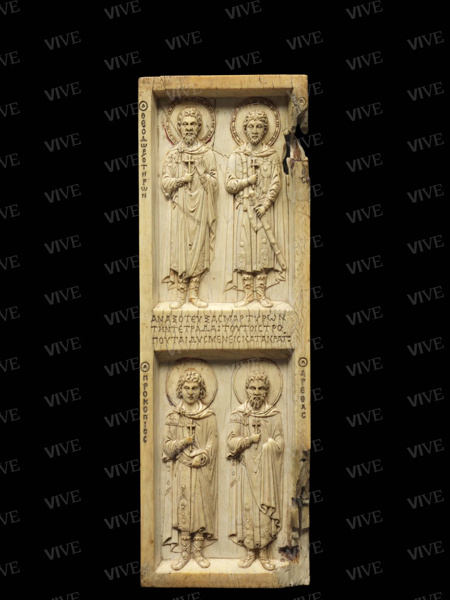 Carved on the ivory triptych are the Deesis (an iconographic representation of Byzantine origin depicting Christ flanked by the Virgin and Saint John the Baptist in the act of praying for sinners) and numerous saints. The ivory, which retains traces of color and gilding, is embellished with engraved inscriptions in Greek. The work, which is extremely elegant in terms of composition and style, was probably produced in Constantinople around the mid-tenth century for the Byzantine emperor Constantine VII Porphyrogenitus (913–959).