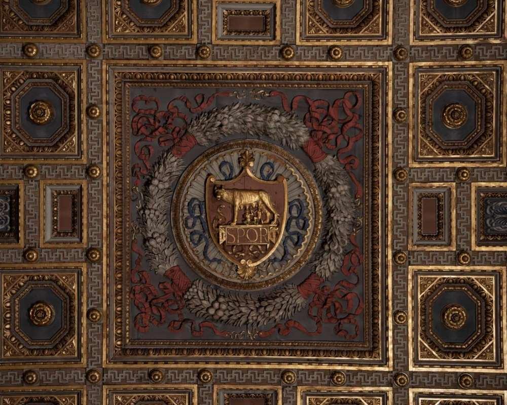 Il soffitto, il lampadario e il pavimento a mosaico furono aggiunti nel corso degli anni Venti del Novecento da Hermanin. Il soffitto si rifà a un modello del 1496, ancor oggi esistente nella chiesa di San Vittore a Vallerano, nei pressi di Viterbo: la sola variante, oltre alle dimensioni, consiste nell’aggiunta di medaglioni con stemmi di Roma e di Venezia.