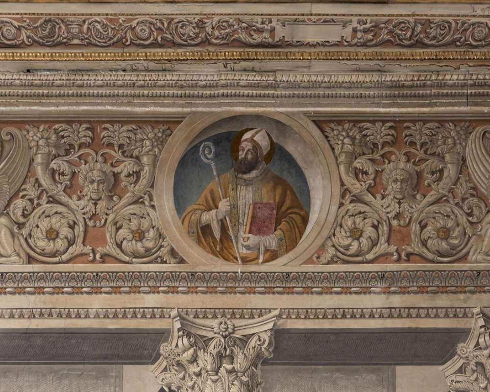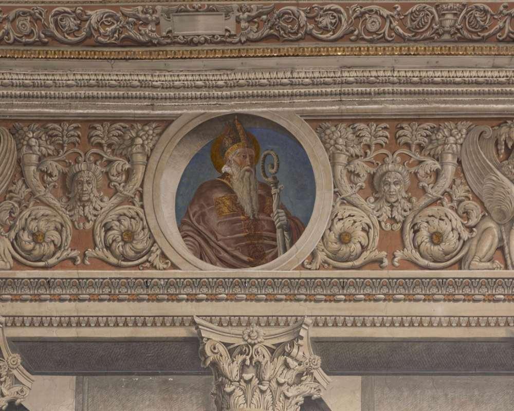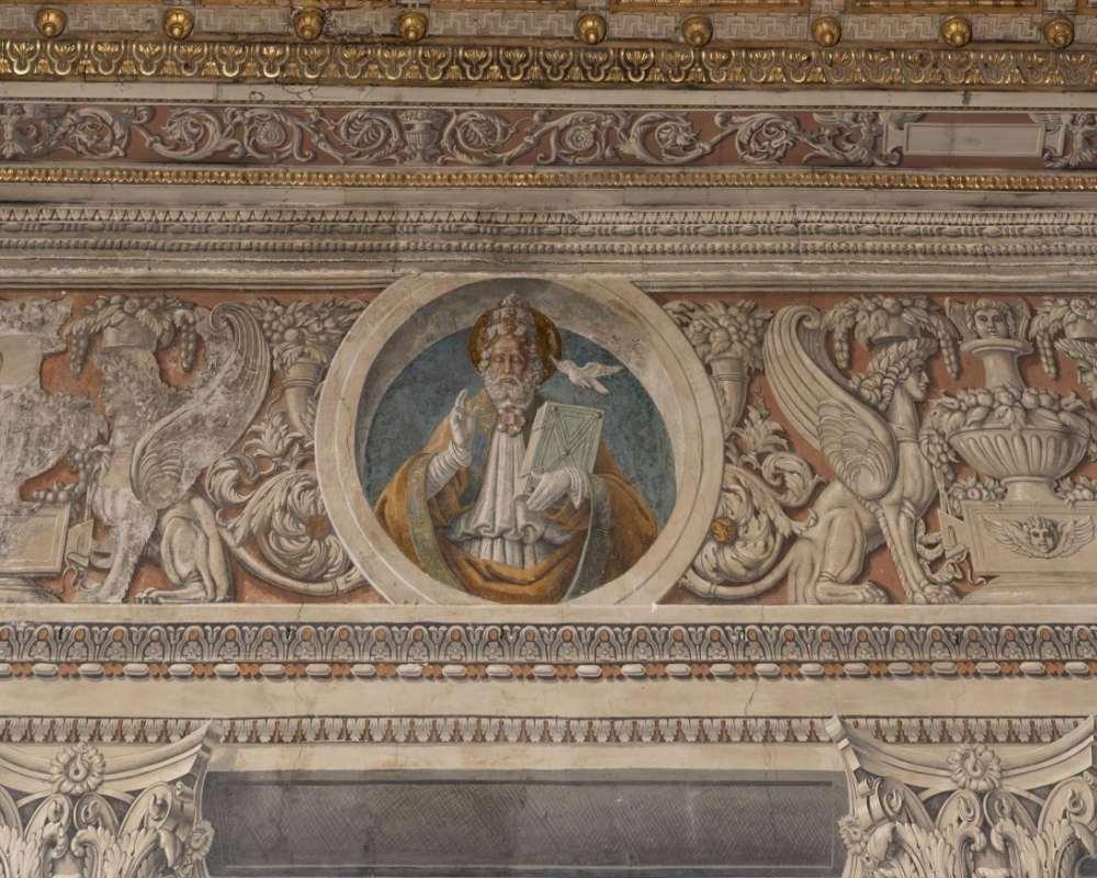 Questa decorazione, avviata sotto Marco Barbo (1420-1491), fu completata da Lorenzo Mari Cibo (1450- 1503) durante il pontificato di Innocenzo VIII (1484-1498), come ricordano i tre stemmi sulla parete occidentale. Successivamente scialbata, ovvero ricoperta da uno strato di intonaco e da altre pitture, essa venne riportata alla luce negli anni Dieci del Novecento: Hermanin ne recuperò i pochi lacerti superstiti, li attribuì ad Andrea Mantegna (1431-1506) e ne affidò l’integrazione al pittore-restauratore Giovanni Costantini (1872-1947).