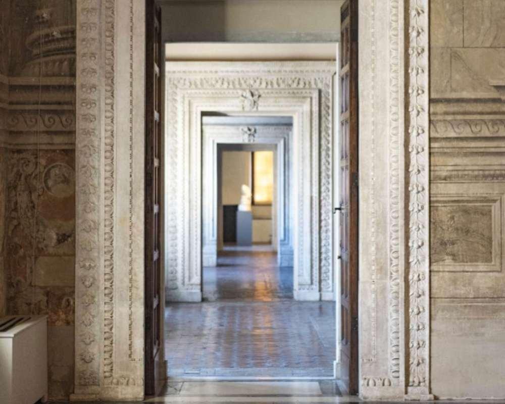 Decorata nella seconda metà del Quattrocento, la sala subì numerose modifiche nel Sei e nel Settecento. A partire dal 1917 lo storico dell’arte Federico Hermanin (1868-1953), allora Soprintendente alle Gallerie e ai Musei del Lazio e degli Abruzzi, ripristinò l’assetto quattrocentesco e riallestì l’ambiente nelle forme di una dimora rinascimentale. Smontato nel secondo dopoguerra l’allestimento in stile, lasala si fa ammirare oggi per la grandiosità dello spazio e delle decorazioni. Le pareti presentano una finta architettura che serve ad ampliare illusionisticamente lo spazio: si tratta di un portico con otto colonne su basi in forma di ara classica e un fregio decorato con medaglioni con i Dottori della Chiesa.
